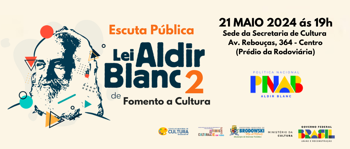 ESCUTA PÚBLICA – A Secretaria Municipal de Cultura da cidade de Brodowski-SP torna público a convocação de artistas, fazedores de cultura, empreendedores culturais, agentes e demais interessados na área cultural para encontro com escutas sobre a construção e definição do PAAR (Plano Anual de Aplicação de Recursos) da Lei nº 14.399, de 08 de julho de 2022. O referido encontro acontecerá no dia 21 de maio de 2024, às 19h , na sede da Secretaria Municipal de Cultura, no seguinte endereço: Av. Rebouças, 364 – Centro – Brodowski-SP.