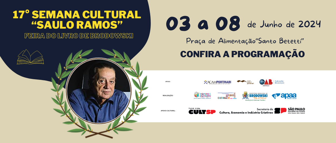 A 17° SEMANA CULTURAL SAULO RAMOS E FEIRA DO LIVRO DE BRODOWSKI é uma realização da Prefeitura do Município de Interesse Turístico de Brodowski, através da Secretaria Municipal de Cultura e Secretaria Municipal de Educação em parceria com a 252° OAB Subseção de Brodowski-SP. Neste ano de 2024, mais uma vez Brodowski participa de Edital, e com um projeto ousado e bem elaborado, é contemplado novamente com recursos financeiros pagos pela Secretaria da Cultura, Economia e Indústria Criativas do Estado de São Paulo, através da APAA – Associação Paulista Amigos da Arte para execução de atividades artísticas durante a 17ª Semana Cultural Saulo Ramos. Todo o projeto foi elaborado pela Secretaria Municipal de Cultura, a partir da história e do contexto cultural desta semana que homenageia nosso ilustre conterrâneo, advogado, político, jurista, escritor e Ministro da Justiça, Dr. José Saulo Pereira Ramos. Os recursos serão repassados pelo Governo do Estado de São Paulo, diretamente a artistas, músicos, oficineiros e técnicos de som, numa extensa programação cultural, envolvendo a população e especialmente alunos das redes públicas e privadas.