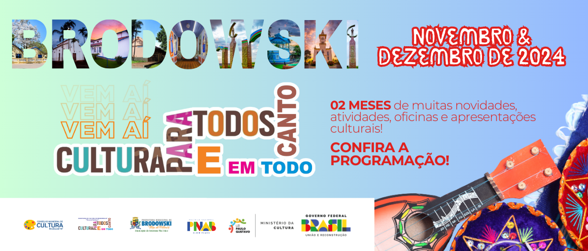 A Prefeitura Municipal de Interesse Turístico de Brodowski-SP, através da Secretaria Municipal de Cultura realiza nos meses de novembro e Dezembro, o maior conjunto de ações culturais que Brodowski já viu. Serão dois meses intensos de projetos culturais divididos em palestras, oficinas, shows musicais, exposições de arte e artesanato, além de apresentações natalinas inéditas e grandiosas. Foram meses intensos de trabalho e dedicação da equipe da Secretaria Cultura em parceria com nosso Conselho Municipal de Cultura, desde a conquista do recurso com nossos Planos de Ação aprovados, passando pela redação dos editais, até a conclusão final dos trabalhos, tanto com a Lei Paulo Gustavo (Lei Complementar nº 195/2022) e agora também com a Política Nacional Aldir Blanc de Fomento à Cultura (PNAB), instituída pela Lei nº 14.399, de 08 de julho de 2022.
