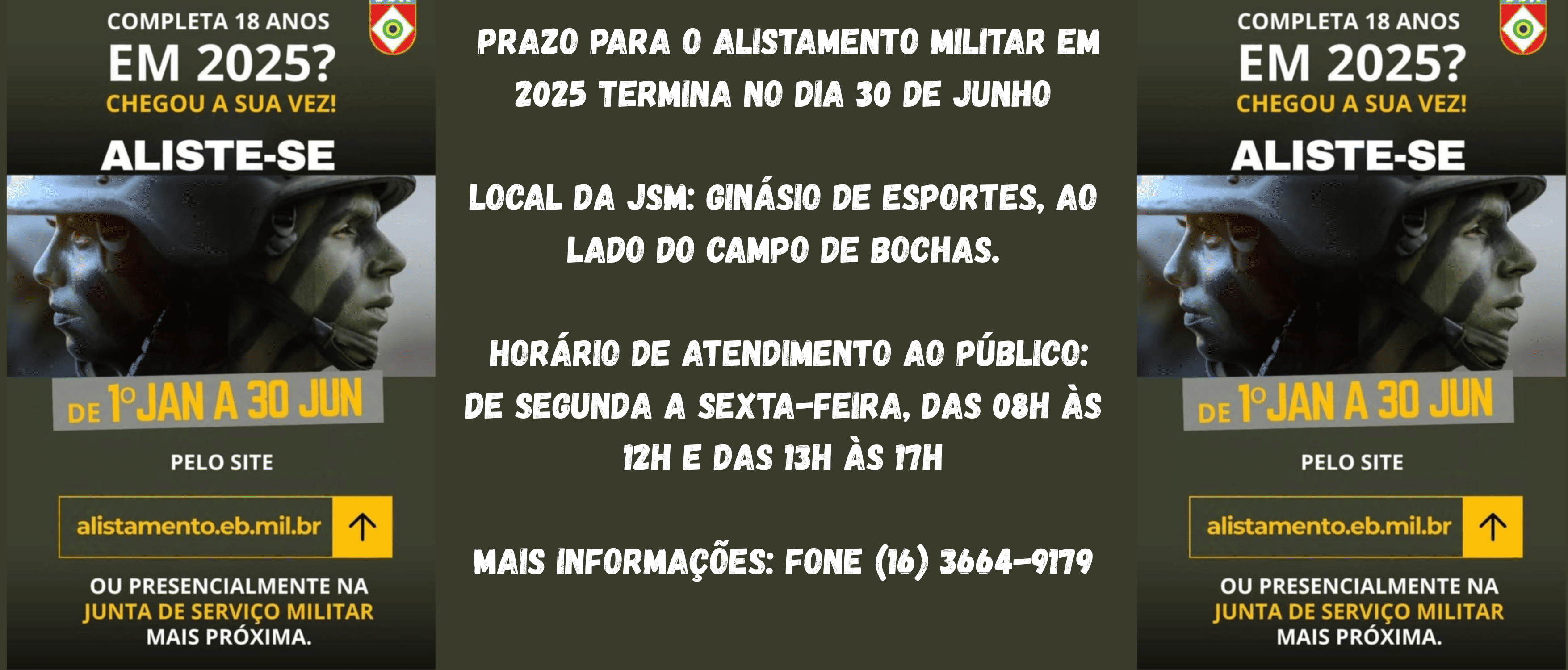 Para os cidadãos que completam 18 anos em 2025 (classe de 2007), o prazo para o Alistamento Militar é até o dia 30 de junho de 2025. Os jovens deverão comparecer à 019ª Junta Militar, munidos com os seguintes documentos: RG, CPF, comprovante de residência, número de celular e endereço de e-mail pessoal.