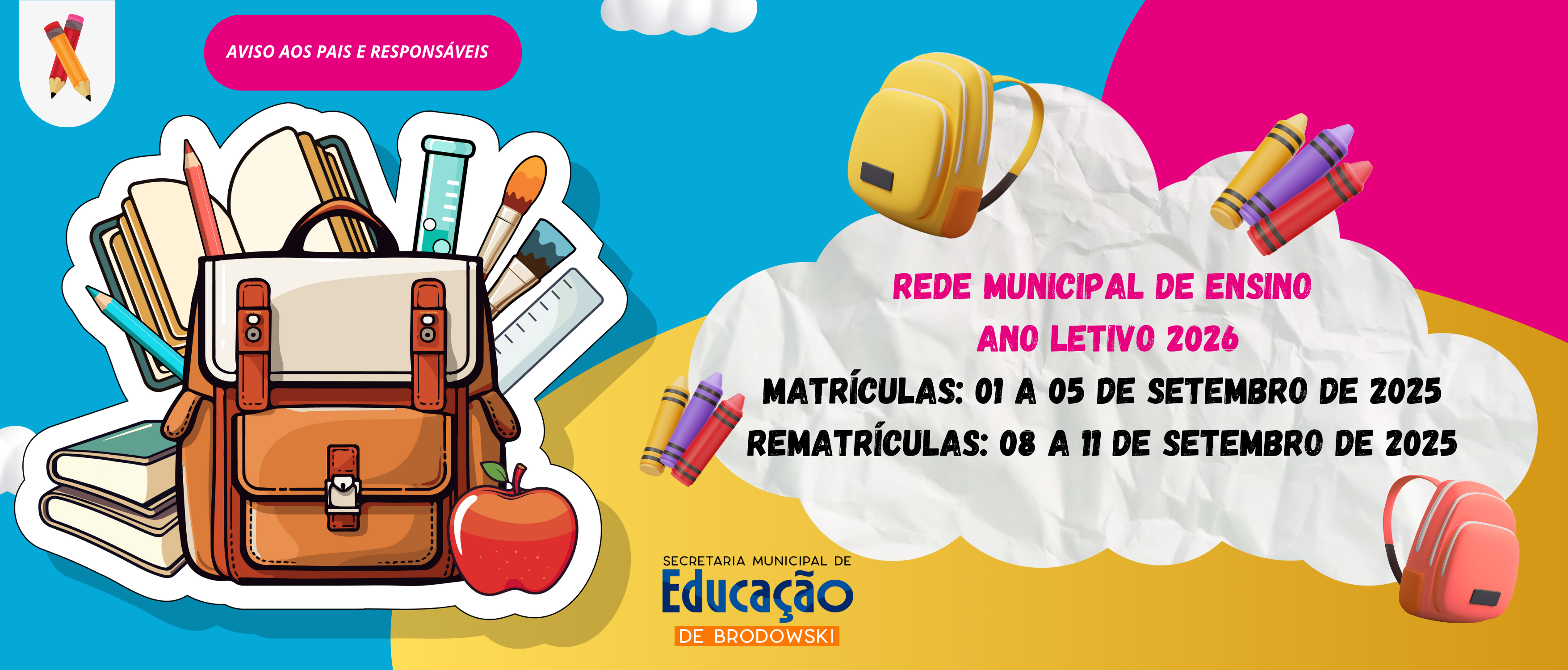A Secretaria Municipal de Educação informa que o período de Matrículas e Rematrículas para o ano letivo de 2026 ocorrerá nas datas abaixo em todas as escolas da Rede Municipal de Ensino: