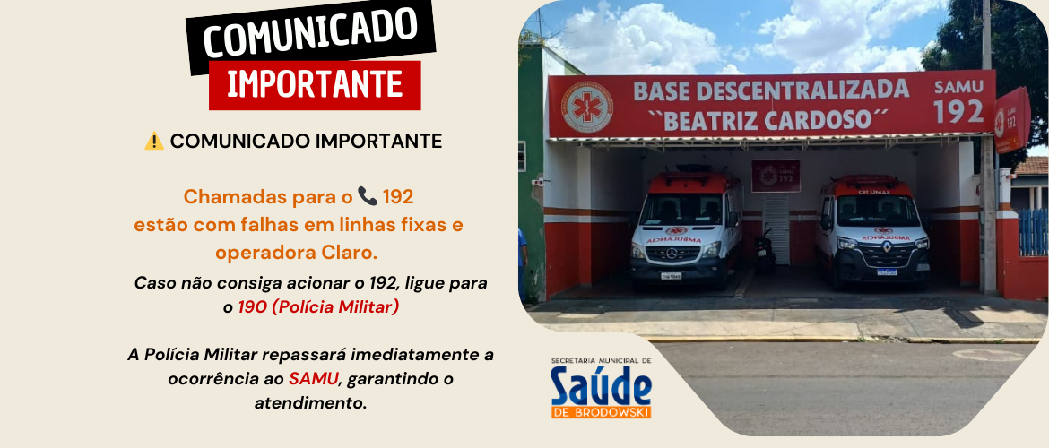A Secretaria Municipal de Saúde de Brodowski informa que estamos enfrentando problemas técnicos na antena responsável pelas ligações do SAMU (192) em nossa cidade.